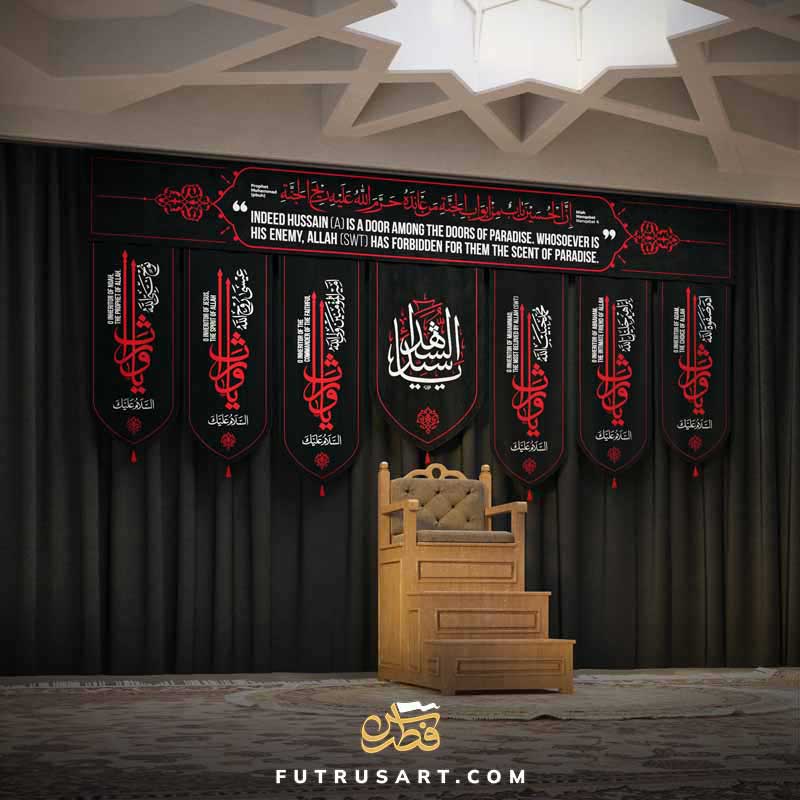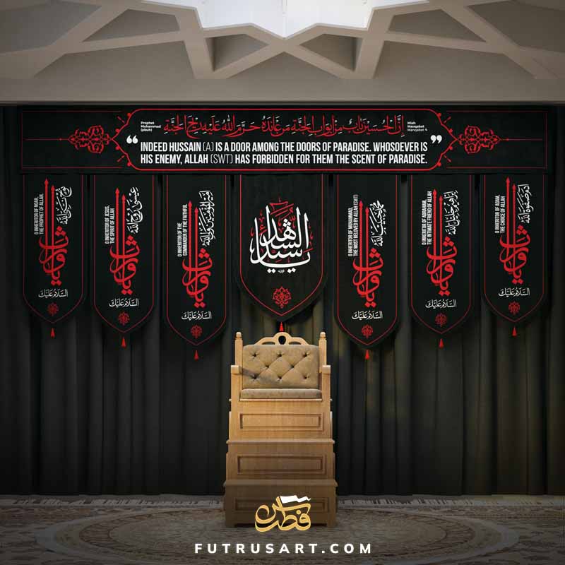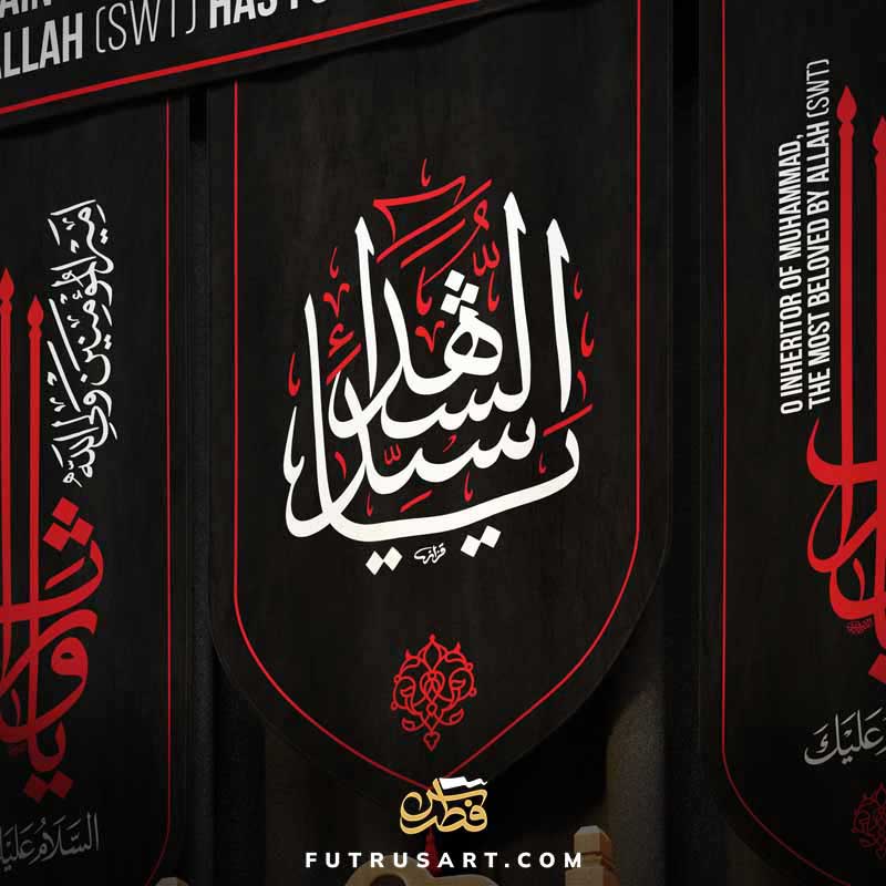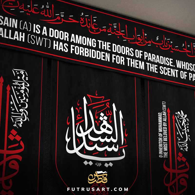 6 Salaams from Ziyarat Waris and a Hadith regarding Imam Hussain (as) along with English translation. Art Inspiration from Banners of Haram of Imam Hussain as in Karbala.