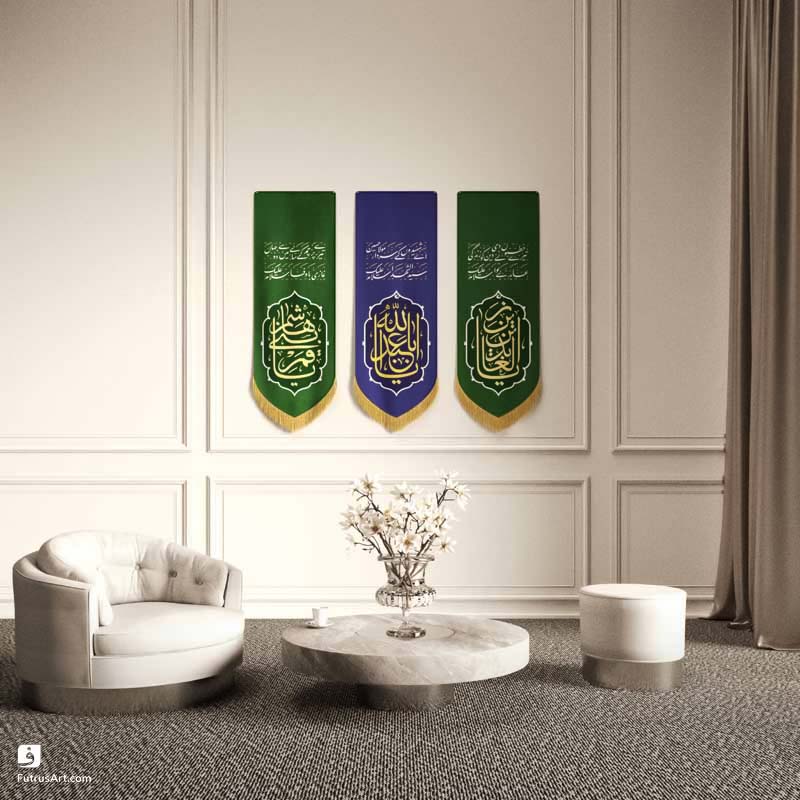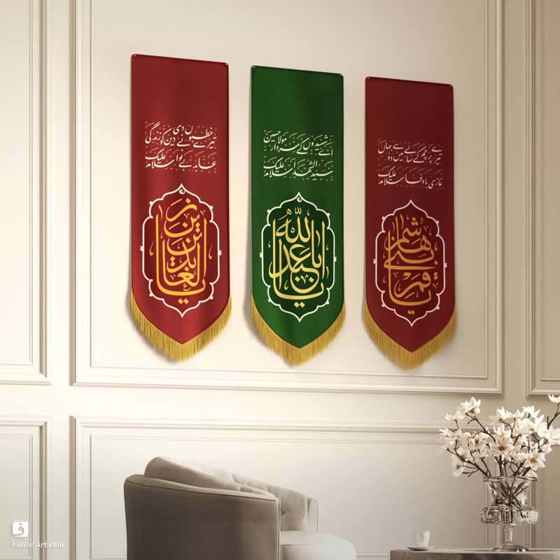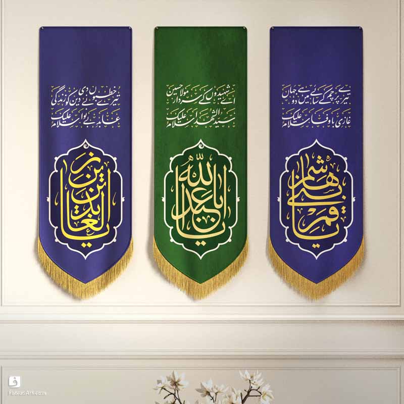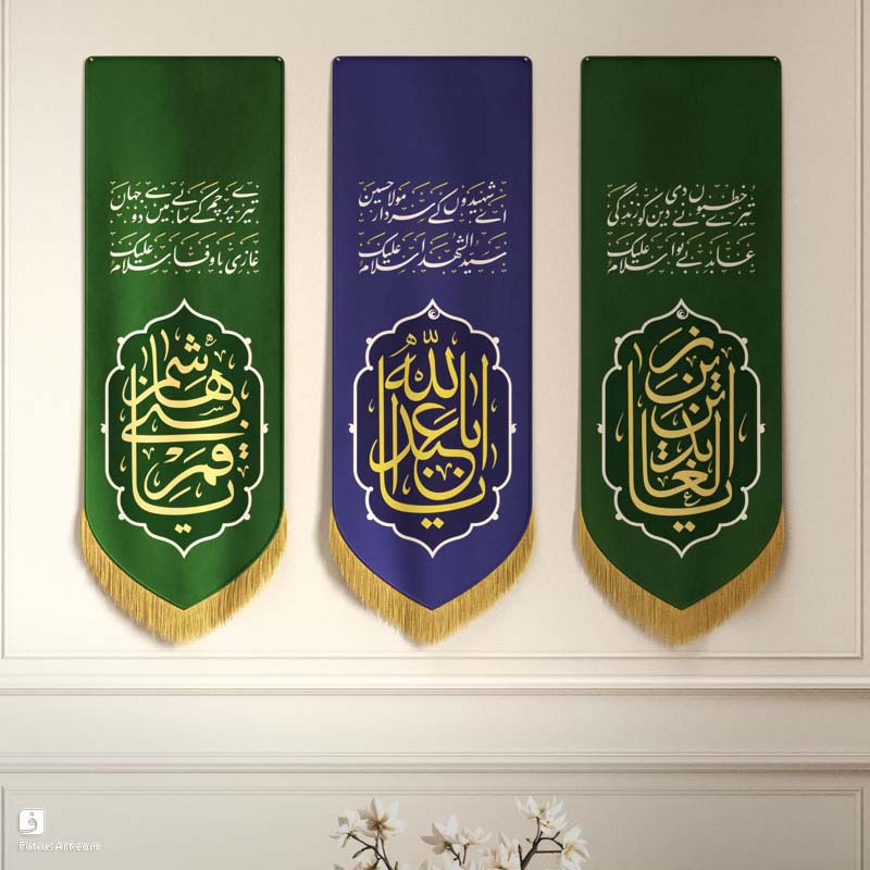 The Set of 3 Banners comprises the art of Titles of Imam Hussain, Imam Sajjad, and Hazrat Abbas (a)” with the famous Urdu Salam